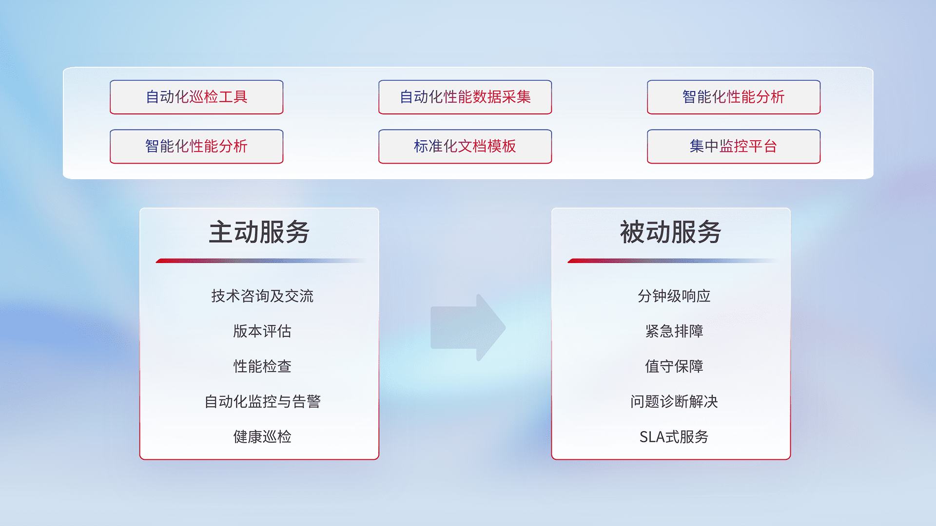 智能化工具和标准化文档,,,保障服务质量,,,,提供主动服务(包含技术咨询、、、、版本评估、、、、性能检查、、、自动化监控与告警、、健康巡检)和被动服务包含(分钟级响应、、、、紧急排障、、值守保障、、、问题诊断解决、、、、SLA服务)。。